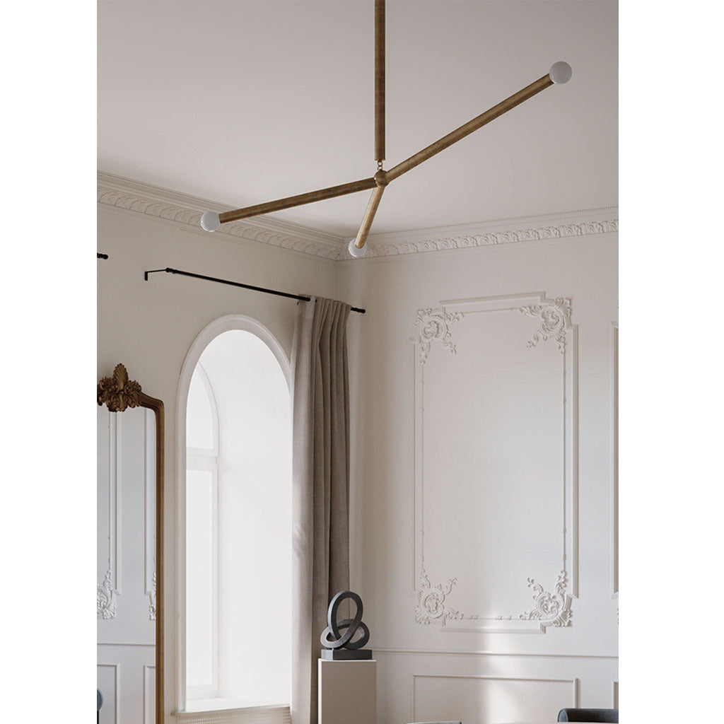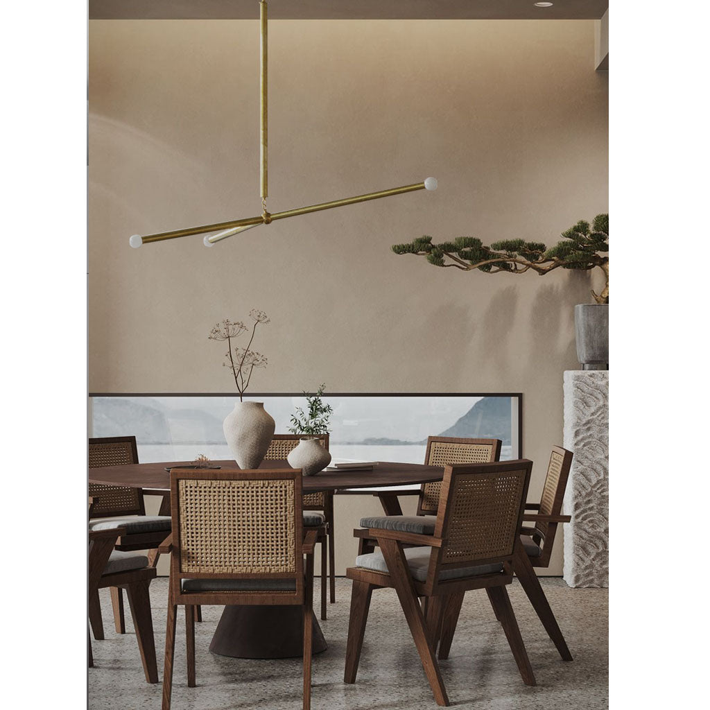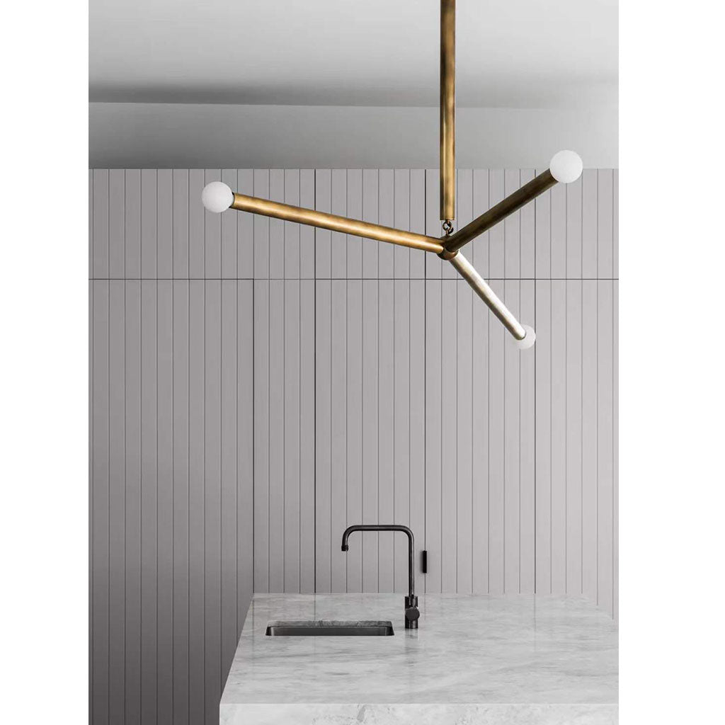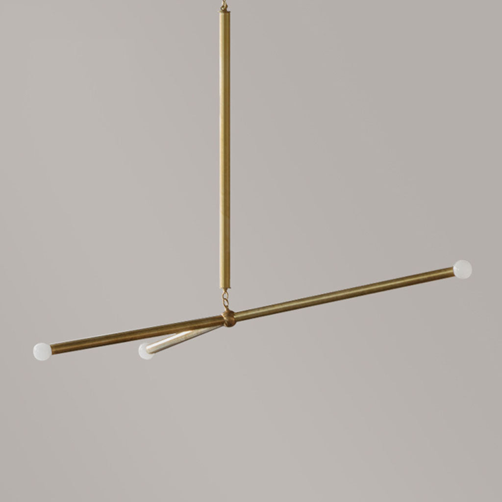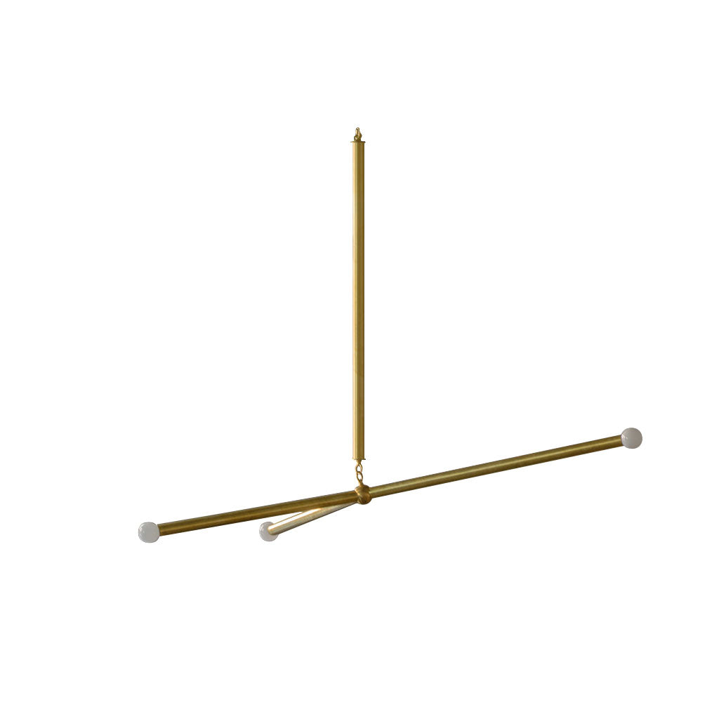 The ARROW Pendant Light represents an arrow in its simplest form—a line segment with a triangle affixed to one end. The trajectory of the arrow is determined by weights that remain hidden within the fixture.